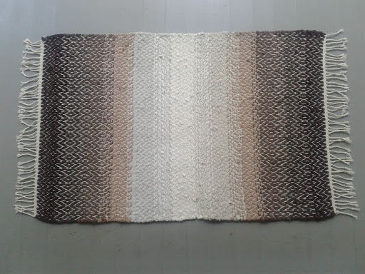 This rug is so thick that the Toika temple didn't want to stay in. If I wasn't careful, it bounced right out when I beat the fell. It feels great to use up this weft material, which has been sitting around waiting to be used for about two years. A different treadling sequence might have worked better; if I had it to do over, I would choose either straight draw (A) or a dornick (E/F) to avoid the longer warp floats, which give a slight bunching effect due to the very thick weft. But I'm happy overall, as it was really fun to see the gradation effect come out.