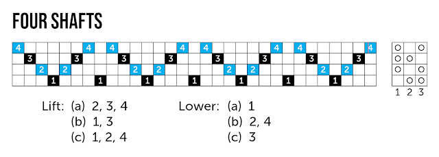 Follow the a-b-c sequence below for which shafts to lift & lower, and you will produce exactly the same pattern as you would using the traditional point twill set-up on three shafts.